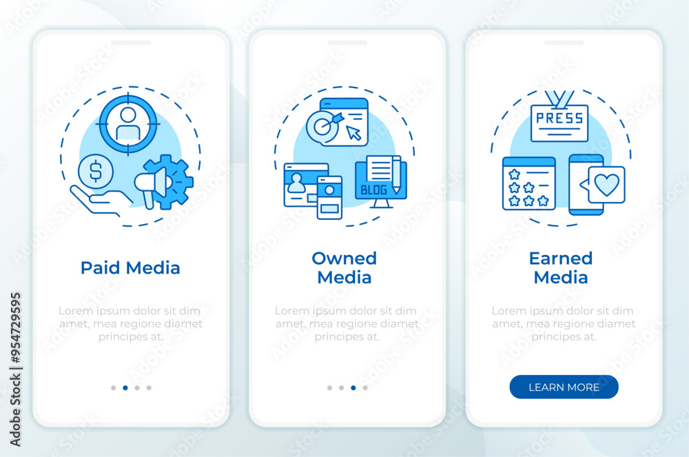 Poster digital media trifecta blue onboarding mobile app screen. walkthrough 3 steps editable graphic instr - Posters Poster digital media trifecta blue onboarding mobile app screen. walkthrough 3 steps editable graphic instr - Posters