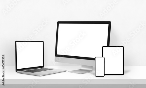 The watermark will not be included on Poster.: Display mockups for responsive web page design promotion - laptop, computer display, phone and tablet