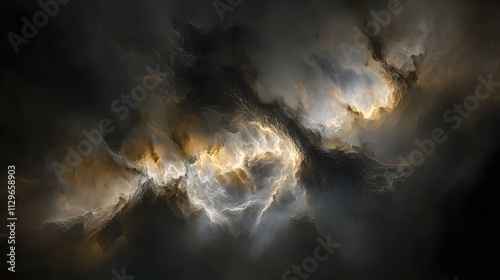Poster : Dramatic cosmic cloudscape with dark swirling fog and golden light beams creating a mysterious atmos