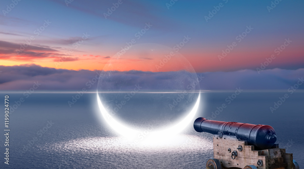 The watermark will not be included on Poster.: Dusk sky with crescent moon on the sea in the clouds with cannon