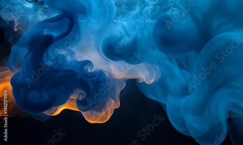 The watermark will not be included on Poster.: Dynamic abstract smoke waves with blue and orange hues creating a mysterious atmosphere in a dark ba
