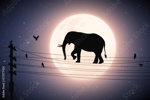 Poster : Elephant walks on power line on moonlight night - silhouette of big animal and birds on electrical wi