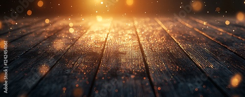 Empty brown wooden floor with blurred abstract night lights and bokeh, creating a perfect space for Poster