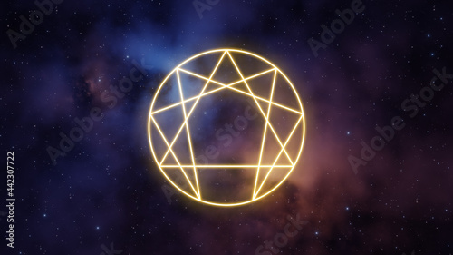 Poster : Enneagram symbol in yellow color on a background of the universe with nebulae