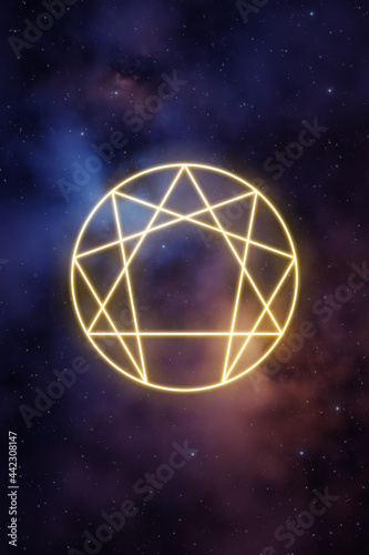 The watermark will not be included on Poster.: Enneagram symbol in yellow color on a background of the universe with nebulae