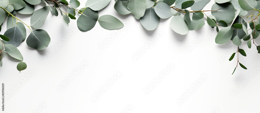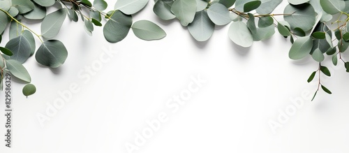 Poster eucalyptus branches and leaves formed into a wreath frame set against a white background for a lay f
