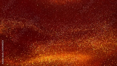 Poster falling jets of gold particles in red liquid. gold dust particles floating and dispersing in red flu