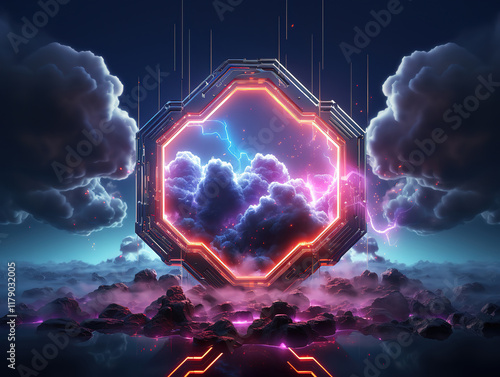 Fantastic abstract neon background with stormy cloud and hexagonal frame glowing with colorful lightPoster