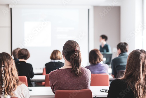 The watermark will not be included on Poster.: Female speaker giving presentation in lecture hall at university workshop - participants listening t