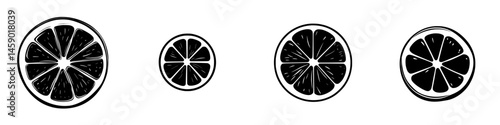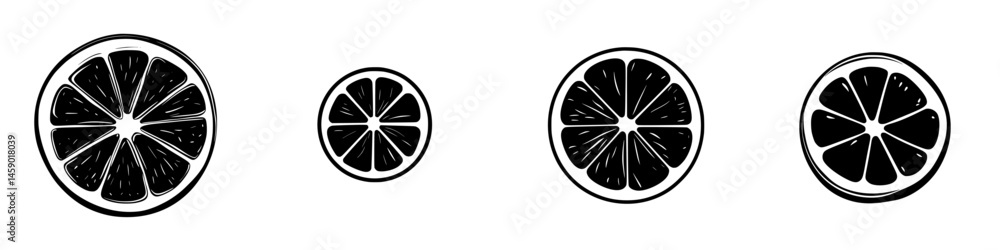 The watermark will not be included on Poster.: Flat black icons of sliced lemon in various sizes showcasing detailed texture and design characteris
