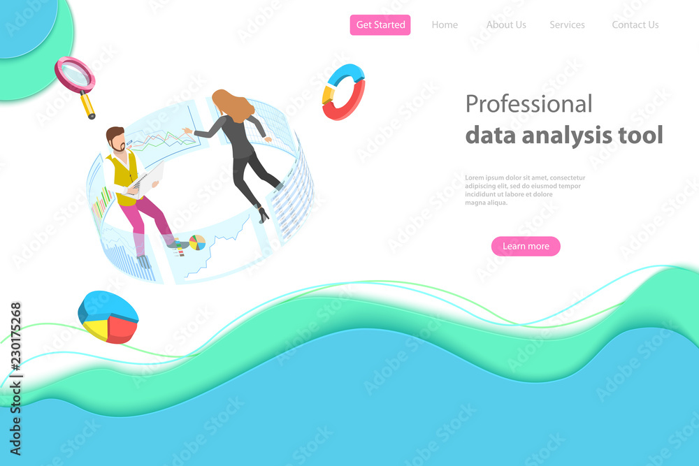 The watermark will not be included on Poster.: Flat isometric vector landing page template for data analysis, web analytics, seo audit report, mark