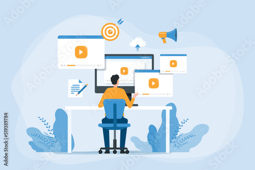 The watermark will not be included on Poster.: Flat vector business video marketing content online concept and people create video and upload on cl
