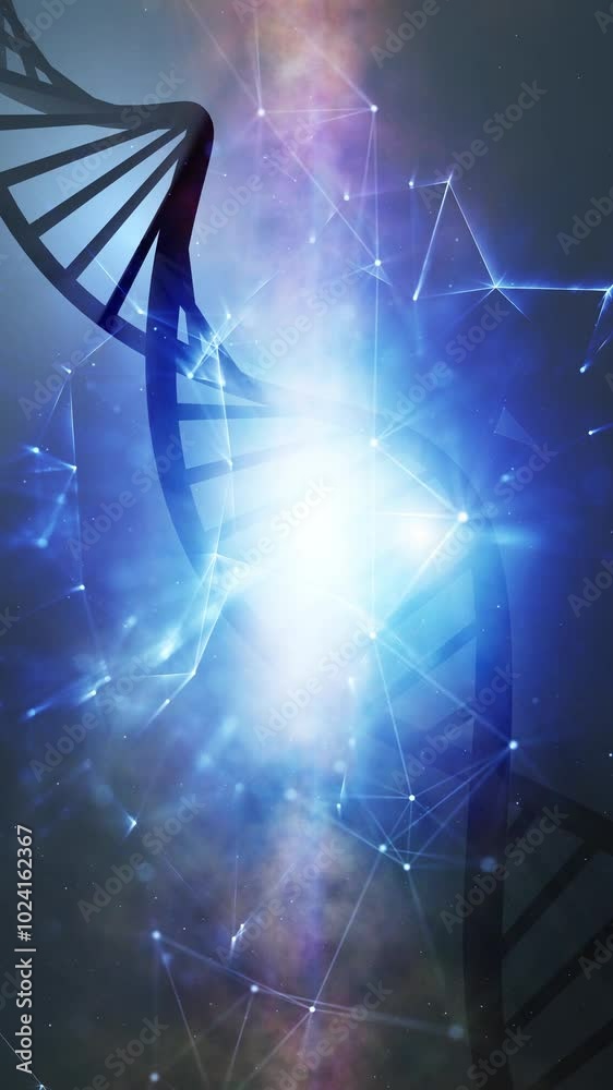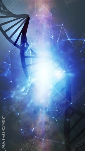 The watermark will not be included on Poster.: Flicker glow light digital technology network with 3d dna chain loop vertical background -