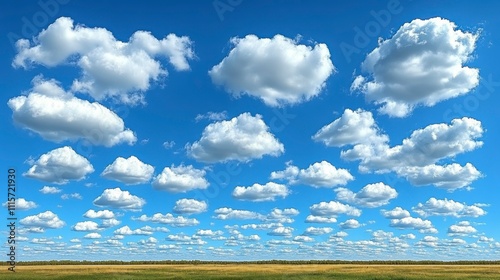 The watermark will not be included on Poster.: Fluffy cumulus clouds scattered across a clear blue sky creating a peaceful and uplifting atmosphere