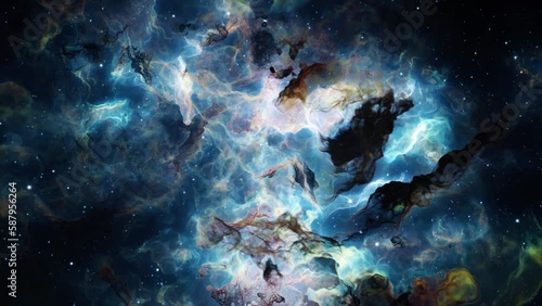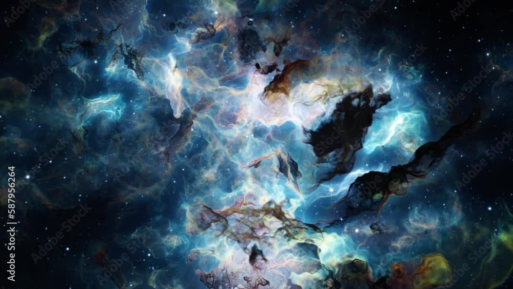 Poster flying through deep space stars and nebula. realistic 3d animation