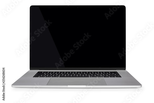 Front view of a generic modern laptop with a black screen and isolated on a white background (copy sPoster