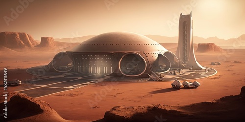 The watermark will not be included on Poster.: Futuristic building habitat on mars settlement from sci-fi novel - superlative generative ai image -