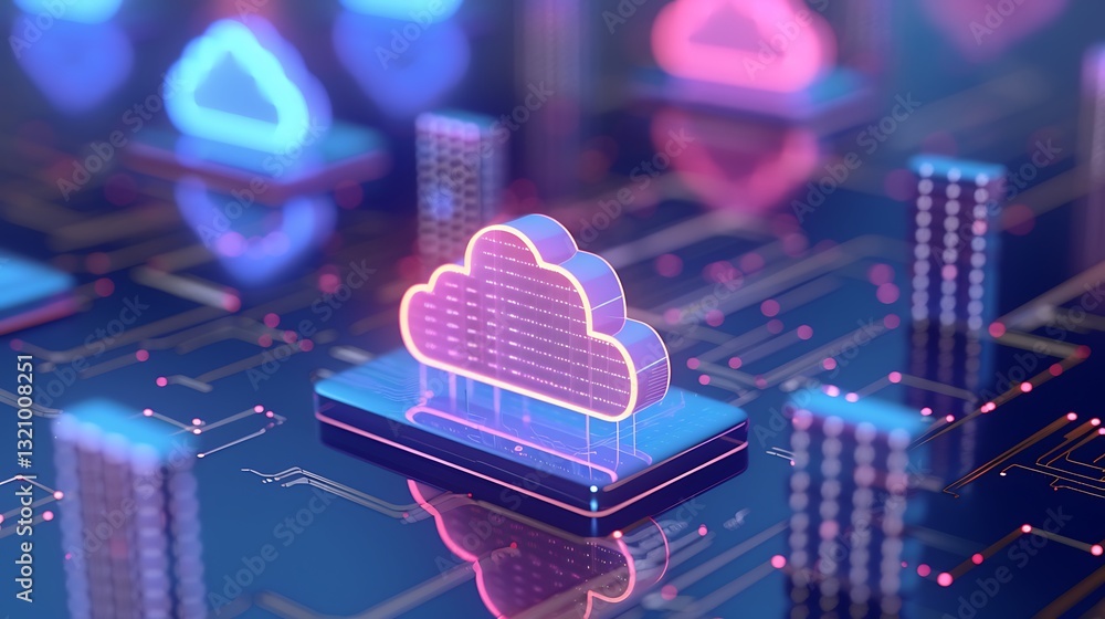The watermark will not be included on Poster.: Futuristic cloud computing concept with neon lights and digital data circuits in blue and pink tones