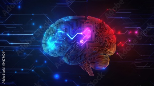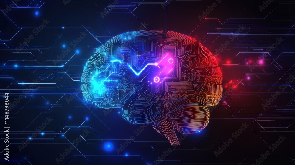The watermark will not be included on Poster.: Futuristic digital brain with colorful circuit design and light effects