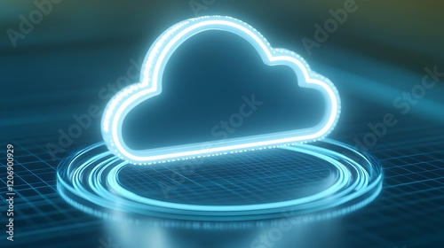 The watermark will not be included on Poster.: Futuristic digital cloud icon in neon style with geometric elements on a technology background