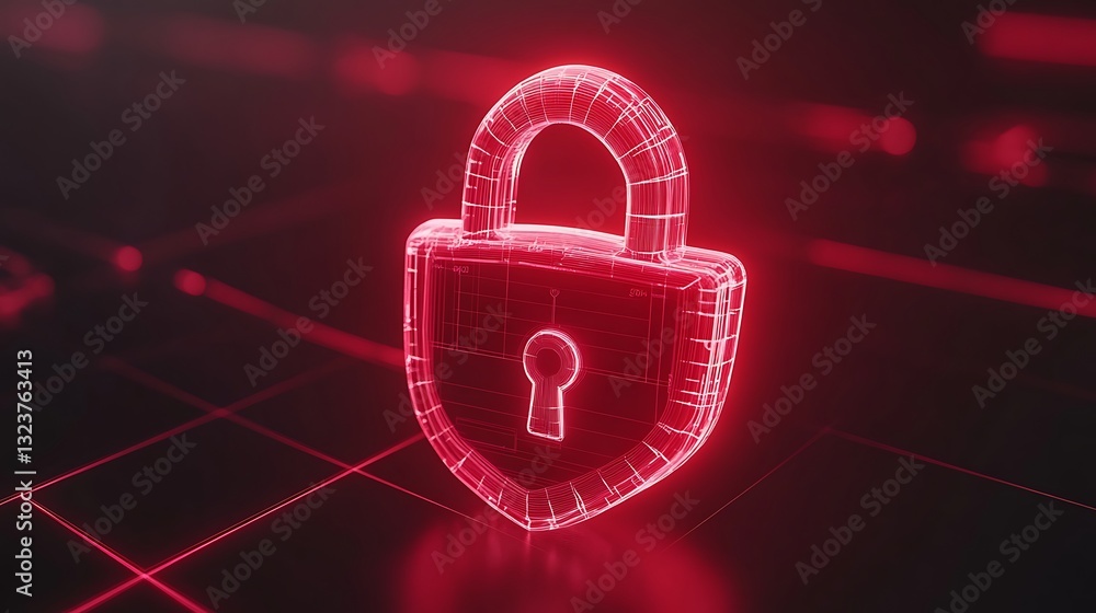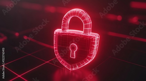 The watermark will not be included on Poster.: Futuristic digital lock symbol in neon red color with wireframe appearance and glowing effects