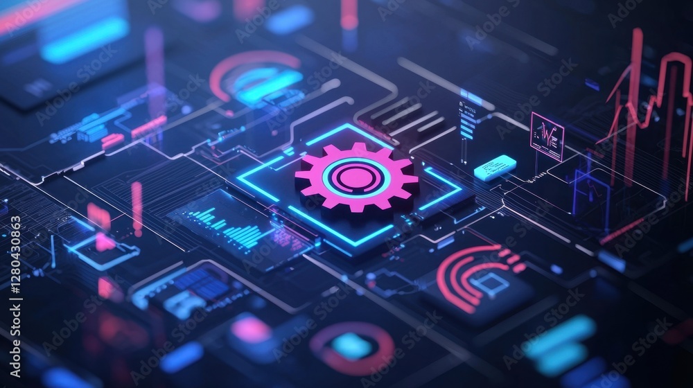 The watermark will not be included on Poster.: Futuristic digital network with neon gear icon representing technology and innovation in a high-tech