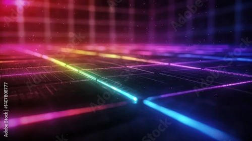 The watermark will not be included on Poster.: Futuristic grid network with vibrant neon lines in a dark room