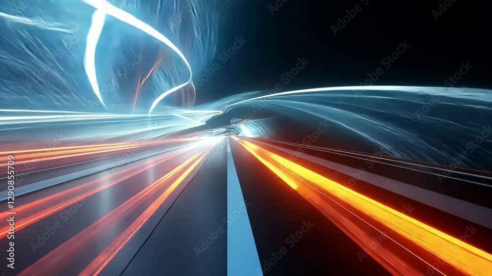 Futuristic light trails in a dark tunnel creating motion illusionPoster