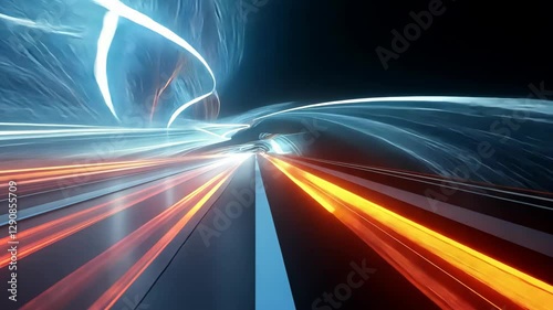 The watermark will not be included on Poster.: Futuristic light trails in a dark tunnel creating motion illusion