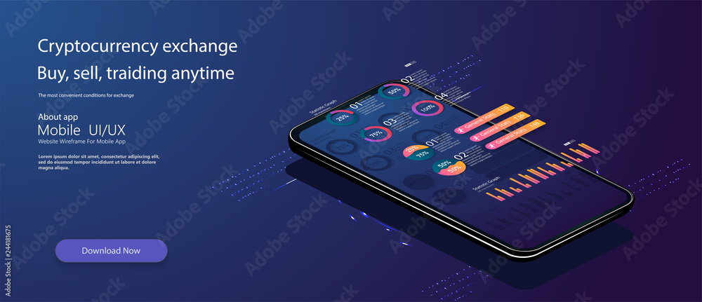 Poster futuristic mobile technology concept. market trend analysis on smartphone with line chart and graphs