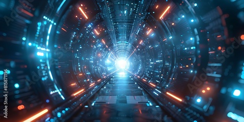 The watermark will not be included on Poster.: Futuristic virtual tunnel with luminous beams and dimensional architectural design for video confere