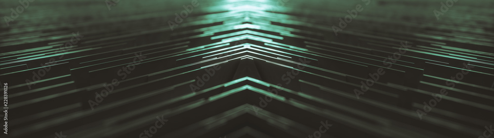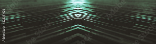 The watermark will not be included on Poster.: Geometric ultra wide background made of many metal walls with glowing light above and depth of field
