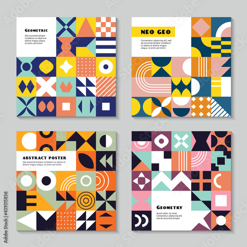 Poster geometrical forms. neo geo style abstract geometric colored shapes triangles squares circles recent