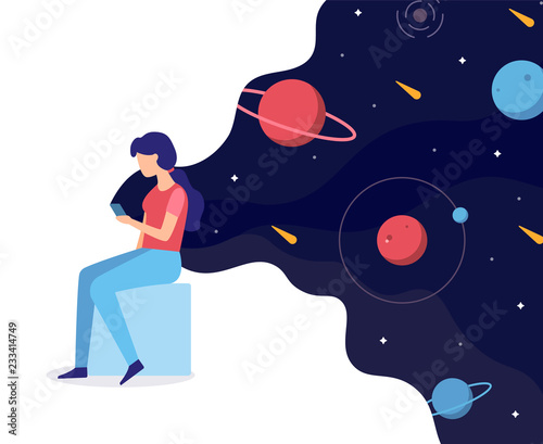The watermark will not be included on Poster.: Girl holding a smartphone in which space - web development business concept - the user uses a new appl