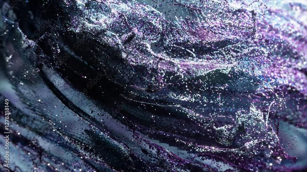 The watermark will not be included on Poster.: Glittering particles swirling and merging into fluid wavy patterns, generating dynamic luminous visu