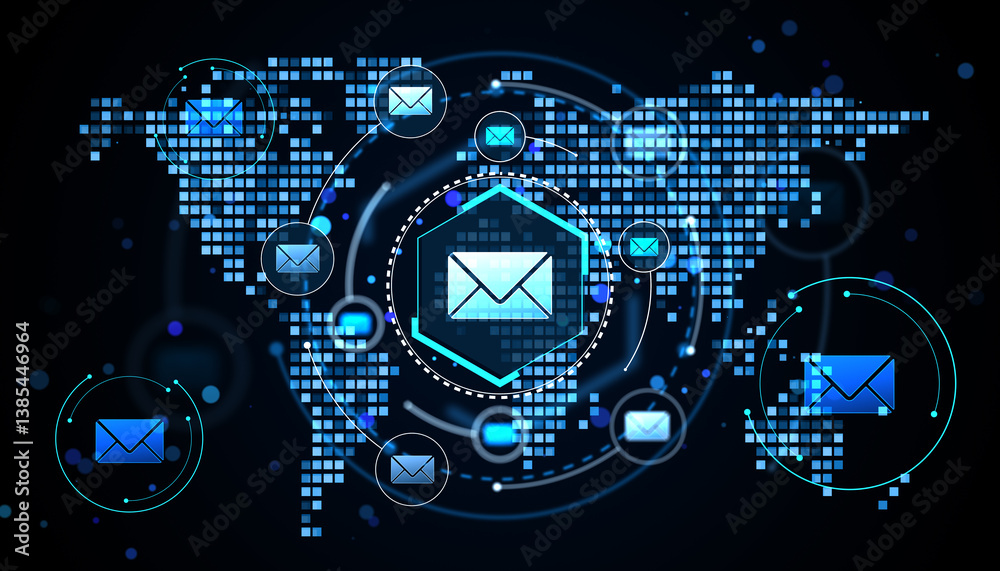 The watermark will not be included on Poster.: Global digital email communication network concept with glowing mail icons on a futuristic pixelated