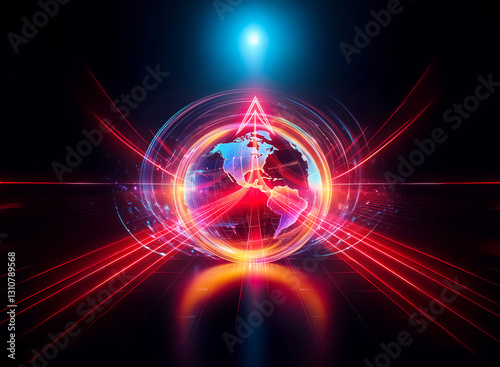 The watermark will not be included on Poster.: Globe with vibrant red and blue light rays emanating from a central point, creating a double exposur