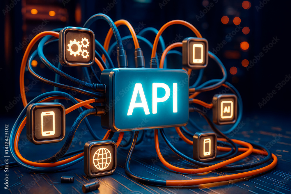 Poster glowing api hub box with cable connections to various digital service icons, symbolizing integration