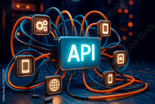 The watermark will not be included on Poster.: Glowing api hub box with cable connections to various digital service icons, symbolizing integration