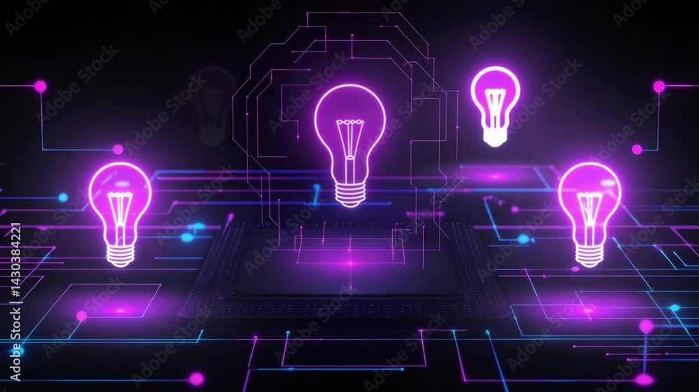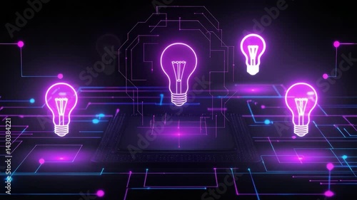 The watermark will not be included on Poster.: Glowing light bulb surrounded by digital circuitry and neon lines in a dark background
