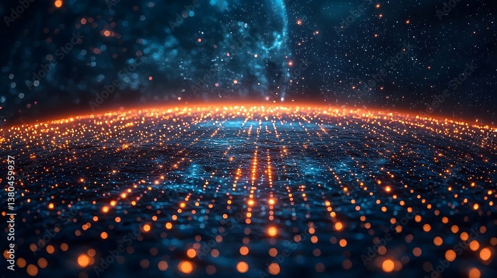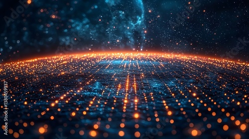 The watermark will not be included on Poster.: Glowing neural network of the quantum internet spanning across a cosmic landscape