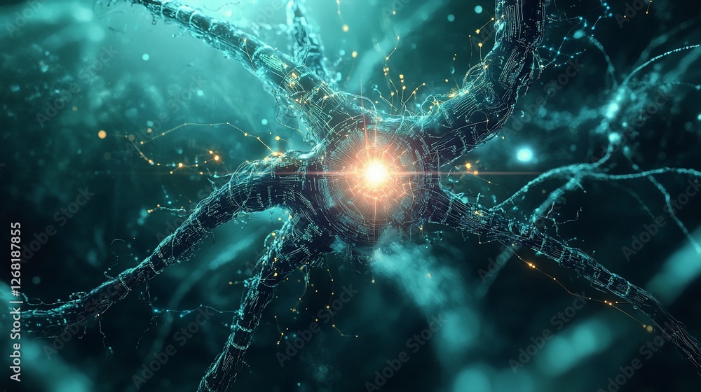 The watermark will not be included on Poster.: Glowing neuron cell with bright core and network of connections -