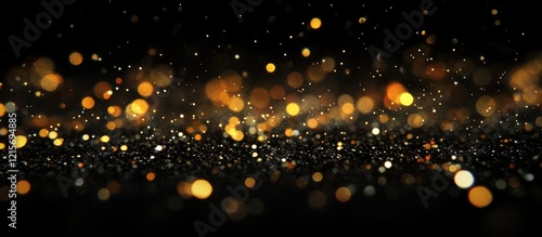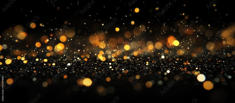 Poster golden bokeh lights on black background with sparkling dust particles and copy space for text placem
