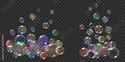 The watermark will not be included on Poster.: Groups of translucent rainbow soap bubbles, isolated on a transparent background - best used on dark