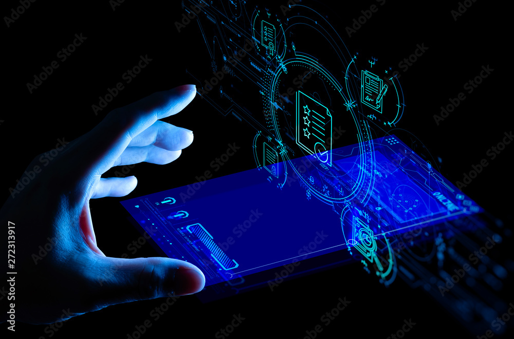 Poster hand touch smart phone icon of document management data system business internet technology concept.
