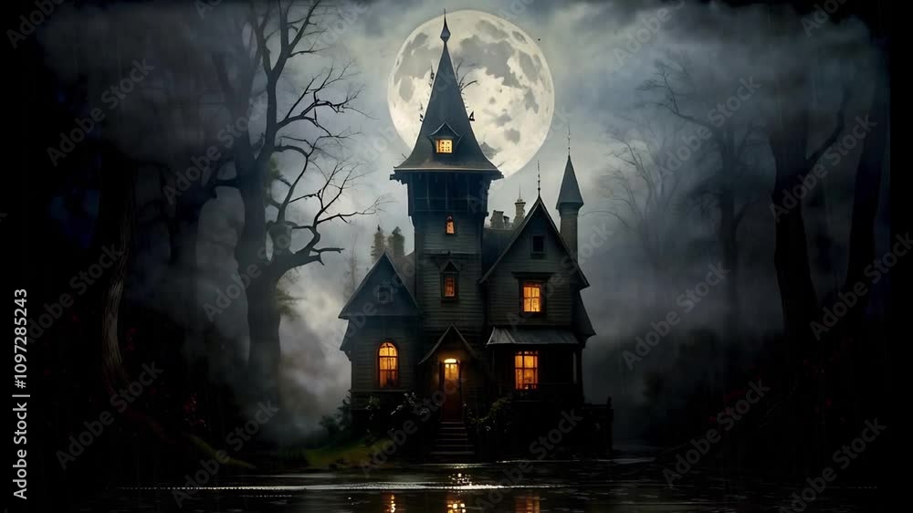 Haunted house with full moon and swamp 4k loop features an a - i - generated video of an old house in aPoster