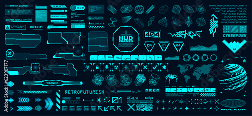 Poster : Hi-tech elements and hud interface - cyberpunk and retrofuturistic graphic box - digital arts, typefac