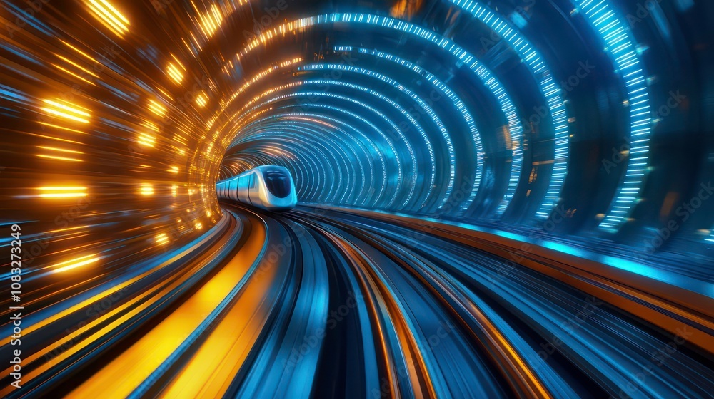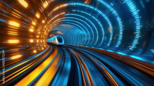 Poster : High speed futuristic train soaring through illuminated digital tunnel representing the rapid progre
