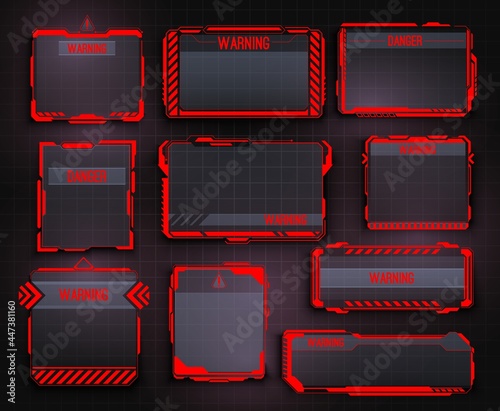 Poster hud warning display and screen frames, danger info borders. safety system alert window, spaceship ca