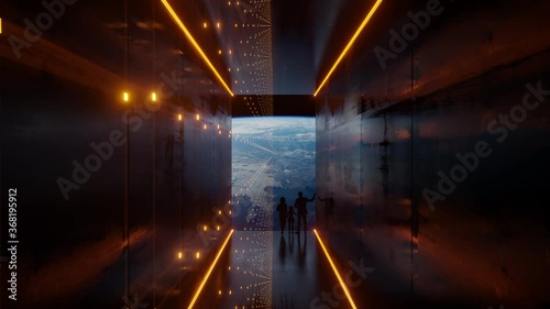 Poster : Huge illuminator of an unknown spaceship interior with scanner at an empty galaxy - 3d iss animation